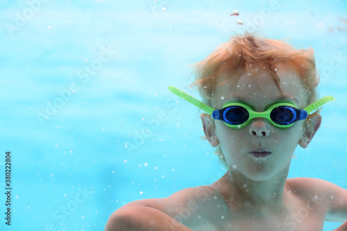 A Blonde Boy Swimming Underwater Wearing Goggles