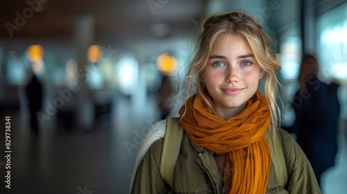 A blonde young woman with striking blue eyes and a yellow scarf at an airport