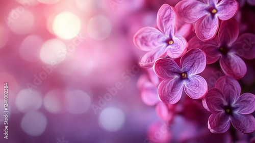 A blooming purple lilac bush in the garden during spring, with vibrant Syringa flowers in closeup, symbolizing renewal, beauty, and tranquility, set against a blurred, empty background