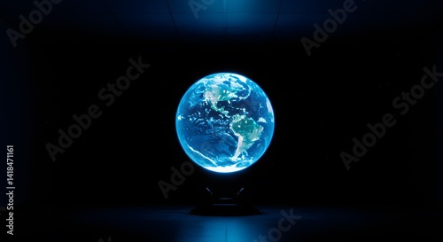 A blue 3d glass sphere shows the planet Earth on a black global background