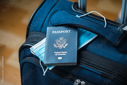 A blue American passport with a blue medical mask on top of a blue suitcase
