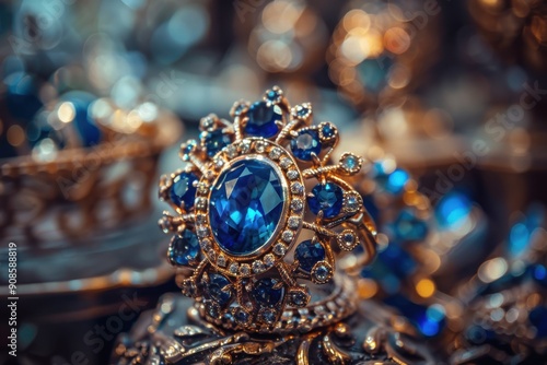 A blue and gold ring with a blue stone in the center