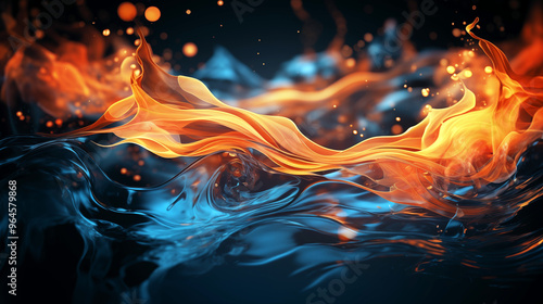 A blue and orange flame is shown in the water. Fire and water