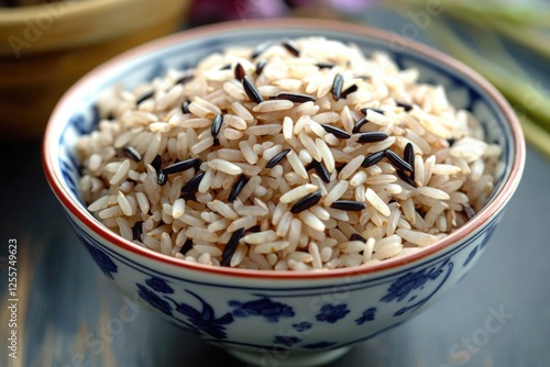 A blue and white ceramic bowl filled with brown rice