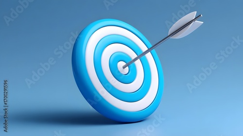 A blue and white circular bullseye target with an arrow precisely placed in the center, symbolizing goal-setting, strategy, and achievement.
