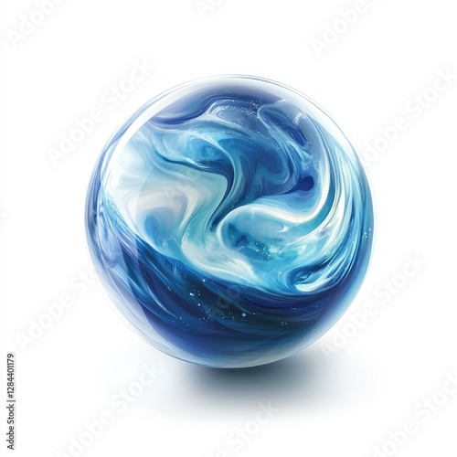 A blue and white swirled glass marble with a shiny finish.