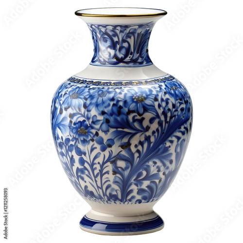 A blue and white vase with a floral design sits on a white background