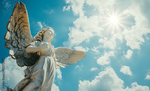 A blue angel with wings and a crown is standing in front of a blue sky. angel is surrounded by a bright light, which gives the image a sense of hope and positivity. heavenly concept. Blue background