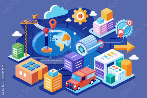 a blue background with a bunch of different items, supply chain optimization solution for streamlining operations and reducing costs
