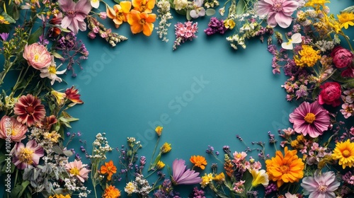 A blue background with a large flower arrangement in the center. The flowers are of various colors and sizes, creating a vibrant and lively atmosphere. The arrangement is surrounded by a frame