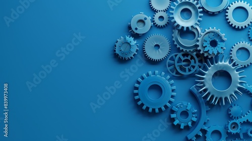 A blue background with a row of gears on it. The gears are all different sizes and are arranged in a circular pattern. Concept of precision and order, as well as the idea of machinery and technology