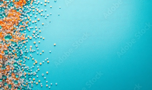 A blue background with a scattering of tiny orange, clear, and white beads on the left side.
