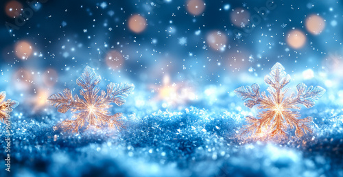 A blue background with snowflakes on it. The snowflakes are lit up and appear to be glowing