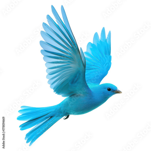 A blue bird in mid-flight. its stunning plumage against a clean white background. symbolizing freedom and natures beauty. ideal for wildlife and nature-themed projects
