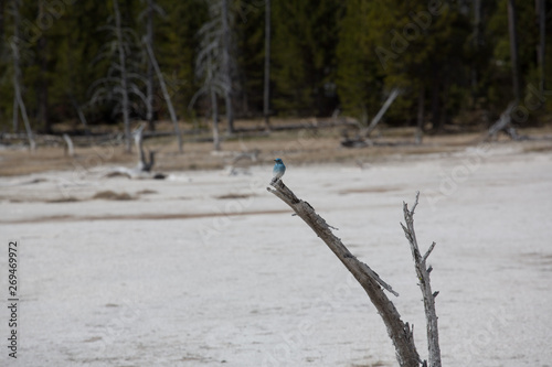 A blue bird pearches on a tree bleached from the geothermal chemicals of Yellowstone National Park, Wyoming. Taken on a mid-May afternoon.