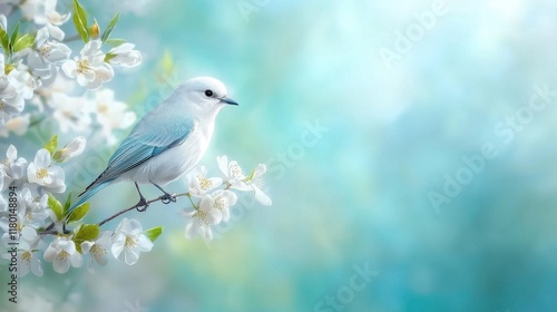 A blue bird sitting on a branch of a tree with white flowers