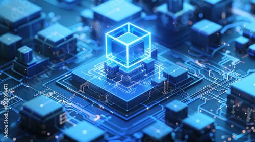 A blue computer chip with a cube on top of it
