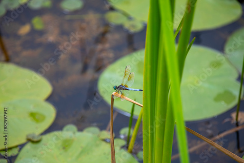 A blue dasher (pachydiplax longipennis) perched next to the marsh water along a hiking trail.
