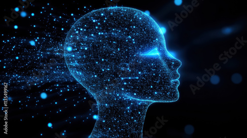 A blue digital human head composed of glowing lines, close-up side view
