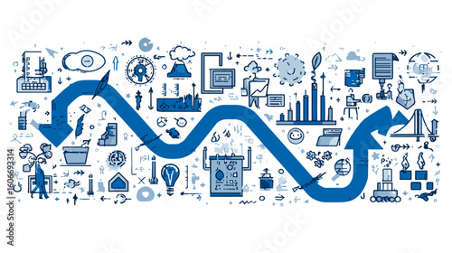 A blue directional arrow zigzags across a black backdrop, intertwined with various icons representing diverse processes and concepts.