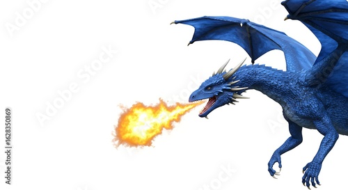 a blue dragon soaring right, breathing fire into the sky, ample copy space on the left, adobe illustrator artwork. ,hyper realistic digital art ,isolated on bright background