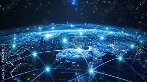 A blue globe with a network of lines connecting it