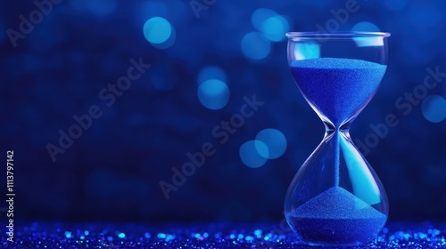 A blue hourglass filled with sand glows against a shimmering background, symbolizing the passage of time in a serene, enchanting setting.