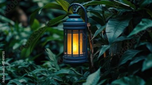 A blue lantern emits a warm glow amidst lush green foliage. Ideal for atmospheric lighting in gardens or patios.
