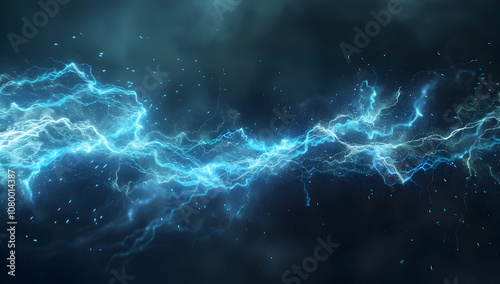 A blue, lightning-like energy wave on a dark background, with glowing particles. -