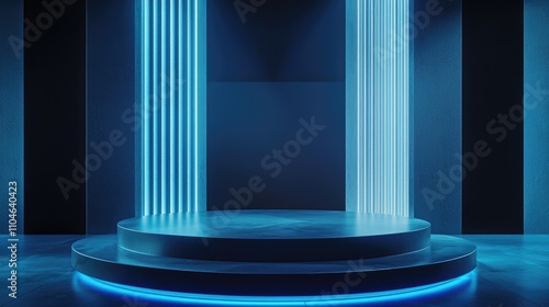 A Blue Neon Lit Round Platform With Glowing Pillars