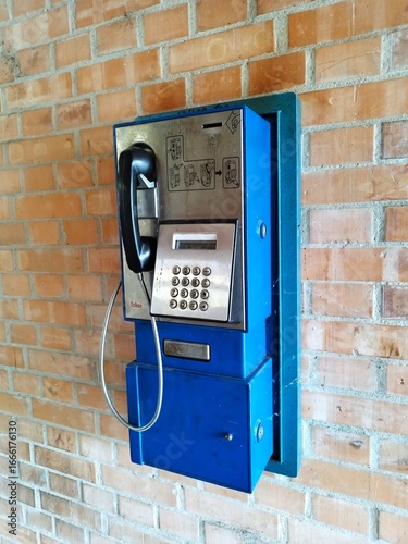A blue public coin-operated telephone set up on a brick wall, photographed slightly from the side.