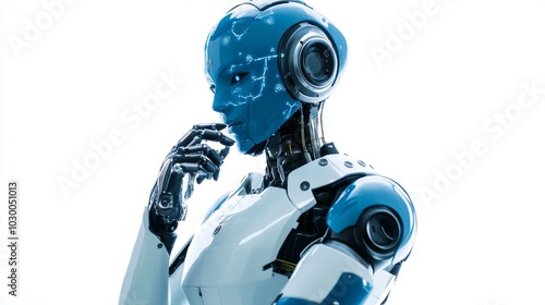 A blue robot stands in a thinking pose, representing the ideas of artificial intelligence, machines learning from data, and connected networks.