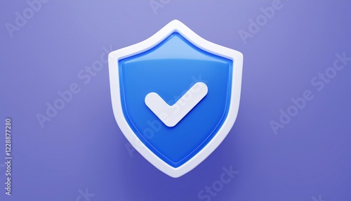 A blue shield with a checkmark symbolizes security and trust in a digital context, set against a purple background.