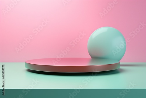 A blue sphere near a pink podium on a pink background. Stand for cosmetics presentation.