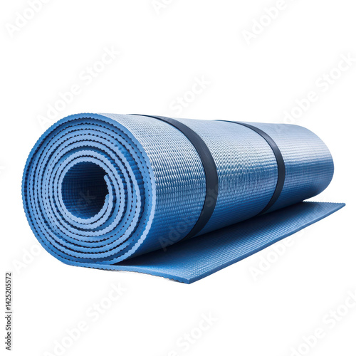 A blue yoga mat rolled up with black straps securing it on a plain surface in a studio setting view