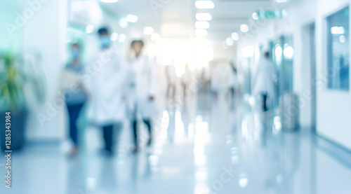A blurred background of a hospital corridor with people walking and medical staff in white coats, with a depth of field effect.