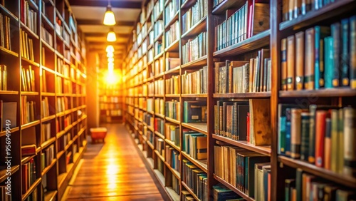 A blurred background of bookshelves filled with academic textbooks, journals, and manuscripts, illuminated by soft natural light, conveying a sense of knowledge and intellectual pursuits.