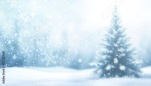 A blurred Christmas tree among a snowy landscape with delicate snowflakes