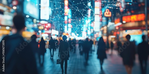 A blurred city image reveals neon lines connecting people and devices, illustrating the evolving landscape of digital communication and connected networks.