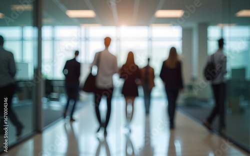 A blurred employees walking in the busy office. High quality