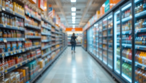 a blurred minimarket aisle, shallow depth of field, warm lighting, clean and modern look