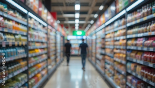 a blurred minimarket aisle, shallow depth of field, warm lighting, clean and modern look