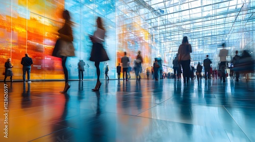 A blurred photo of an international business exhibition, with many elegantly dressed people walking around the floor and holding brochures or looking at posters on display tables,