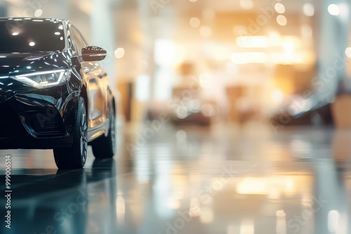A blurry image of a car in a showroom with lights shining on it, generative ai image