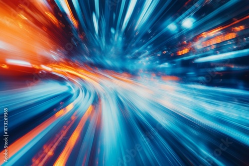 A blurry image of a city street with orange and blue lights