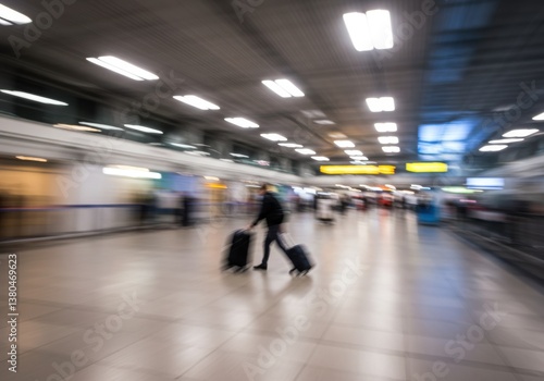 A blurry view of a person pulling luggage through a busy airport terminal with bright overhead lights