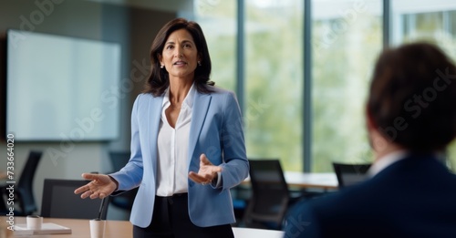 a boardroom setting, of a mature businesswoman confidently presenting her ideas to a group of attentive colleagues