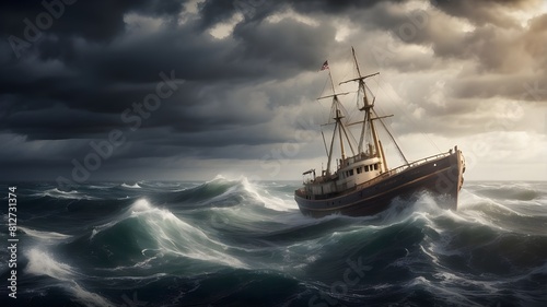 A boat in distress. a ship sailing across a rough, stormy sea that is about to sink. A window of chance to avert a tragedy may exist.