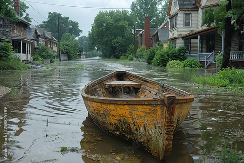A boat sits abandoned in the middle of a flooded street.