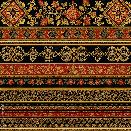 A bold black and red striped pattern featuring intricate gold and red designs, suitable for use in graphic design, packaging or branding